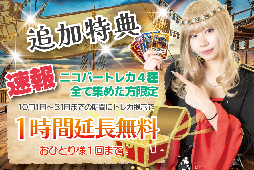 トレカ4種類を全て集めた方は、来月(2025年10月1日~30日まで)ご来店時の1時間分の延長料金が無料になります!