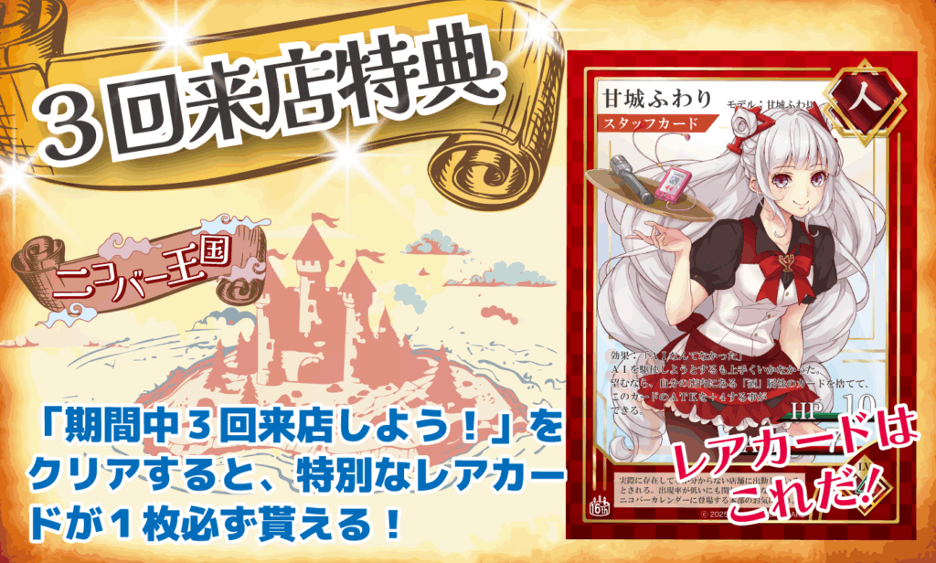 「期間中3回来店しよう!」をクリアすると、ランダムカードでは手に入らない特別なカードがもれなくもらえます!